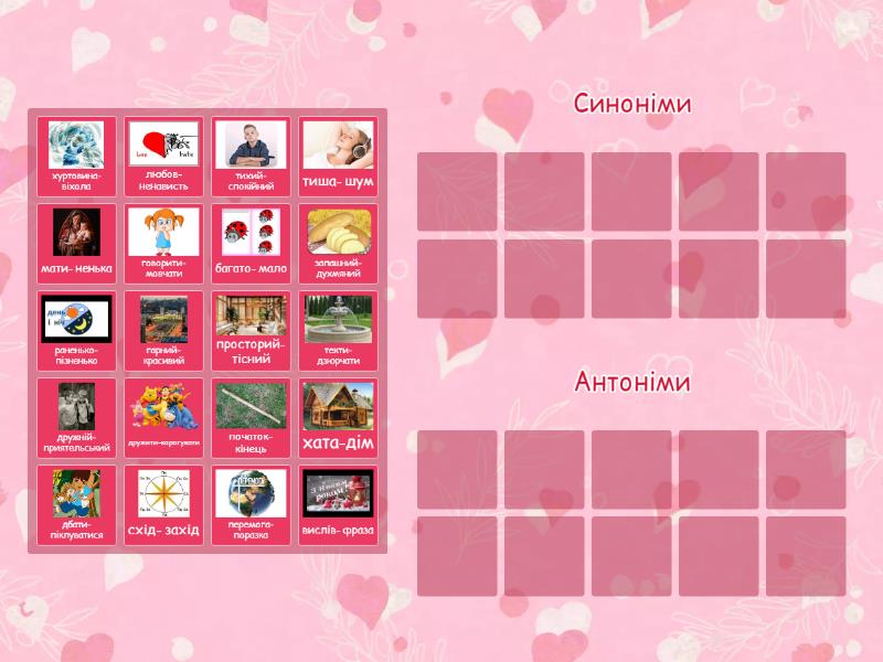 Синоніми: гарний- красивий, текти- дзюрчати, дружній- приятельський, вислів- фраза, хуртовина- віхола, мати- ненька, запашний- духмяний, дбати- піклуватися, тихий- спокійний, хата-дім, Антоніми: дружити-ворогувати, тиша- шум, раненько- пізненько, говорити- мовчати, любов- ненависть, схід- захід, багато- мало, перемога- поразка, початок- кінець, просторий- тісний,