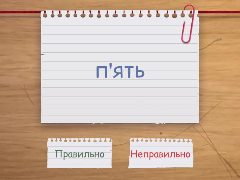 Правильно: п'ять, черв'як, свято, дзвякнути, буряк, комп'ютер, реп'ях, м'який, мавпячий, здоров'я, цвях, тьмяно, п'ятдесят, медвяний, серйозний, арф'яр, пам'ять, Неправильно: пять, червяк, св'ято, дзв'якнути, бур'як, компьютер, репях, мякий, мавп'ячий, здоровья, цв'ях, тьм'яно, пятдесят, медв'яний, сер'йозний, арфяр, память,