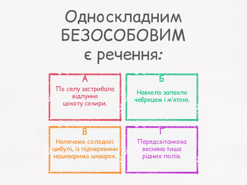 1) Односкладним БЕЗОСОБОВИМ є речення: a) По селу застрибало відлуння цокоту сокири. b) Навколо запахло чебрецем і м’ятою. c) Напечемо солодкої цибулі, із підчеревини нашкваримо шкварок. d) Передсвітанкова весняна тиша рідних полів. 2) Односкладним НАЗИВНИМ в реченні є: a) У тихім сквері серед віт мармурова Венера. b) Вузенька вуличка. Стіна, повита хмелем. c) За вікном жоржини й чорнобривці. d) Твої спогади світлі, але щемливі. 3) Односкладним ОЗНАЧЕНО-ОСОБОВИМ є речення: a) Бережи честь змолоду. b) Ночвами моря не перепливеш. c) Журбою поля не виореш. d) Щозміни норму виконуємо на сто відсотків. 4) Односкладним НЕОЗНАЧЕНО-ОСОБОВИМ є речення: a) Задощило. b) Нарешті ремонтують магістраль. c) Не відчуваю холоду. d) Зробив діло - гуляй сміло. 5) Односкладним УЗАГАЛЬНЕНО-ОСОБОВИМ є речення: a) День народження святкуватиму пізніше. b) Треба читати книги. c) Немає пісні без любові. d) Держи кишеню й уста замкненими. 6) Односкладним УЗАГАЛЬНЕНО-ОСОБОВИМ є речення: a) Весна, і смерть, і світле воскресіння. b) По радіо повідомляють про нельотну погоду. c) Незабаром має світати. d) Дарованому коневі в зуби не дивляться. 7) "Навесні в селі прокидаються рано" - це речення... a) означено-особове b) неозначено-особове c) узагальнено-особове d) безособове 8) "Цього літа градом побило врожай" - це речення... a) означено-особове b) неозначено-особове c) узагальнено-особове d) безособове 9) "Пахощі весняного лугу" - це речення... a) означено-особове b) неозначено-особове c) Пахощі весняного лугу d) називне 10) "Криши, ламай, трощи стереотипи!" - це речення... a) означено-особове b) неозначено-особове c) узагальнено-особове d) безособове 11) "Бери вершину - і матимеш середину!" - це речення... a) означено-особове b) неозначено-особове c) узагальнено-особове d) безособове 12) "Спокійні очі, сива голова, жорстка кирея кольору нічного" - це речення... a) означено-особове b) неозначено-особове c) безособове d) називне