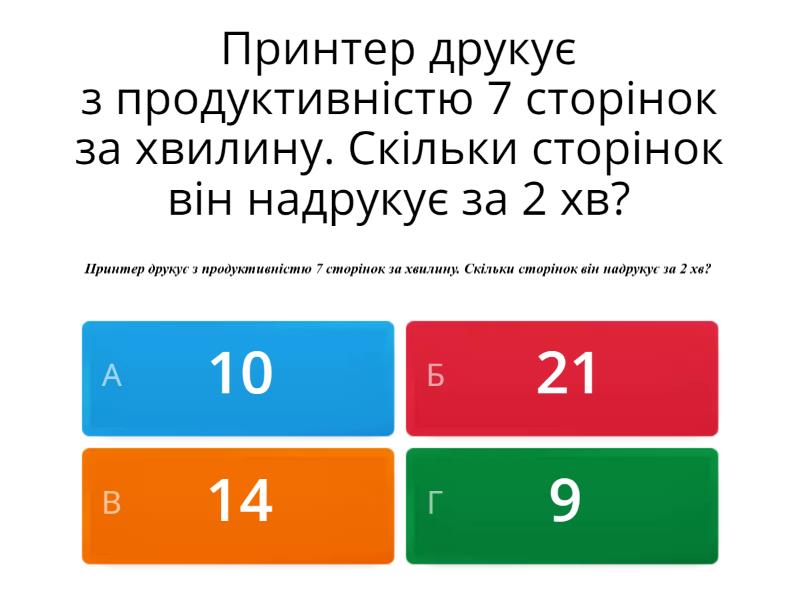 1) Принтер друкує з продуктивністю 7 сторінок за хвилину. Скільки сторінок він надрукує за 2 хв? a) 10 b) 21 c) 14 d) 9 2) Микола встигав відремонтувати 96 приладів за 12 годин. Яка продуктивність у Миколи? a) 8 b) 9 c) 7 d) 6 3) За 3 дні роботи маляр витратив З0 банок фарби. Скільки банок фарби потрібно маляру на 5 днів роботи, якщо його продуктивність праці не зміниться? a) 55 b) 50 c) 60 d) 45 4) Перша бригада за 5 год виготовила 60 деталей. За скільки годин друга бригада виготовить 96 деталей, якщо вони працюють з однаковою продуктивністю праці? a) 6 b) 14 c) 8 d) 10 5) Один учень розв’язав 12 рівнянь за 2 год, а другий – 15 рівнянь за 3 год. У кого з учнів більша продуктивність праці? a) Однакова b) у першого c) у другого 6) Мама з донькою вирішили наліпити вареників. Мати за 1 годину може наліпити 60 вареників, а донька лише 20. Скільки вареників вони зможуть наліпити за 3 години? a) 200 b) 220 c) 240 d) 250