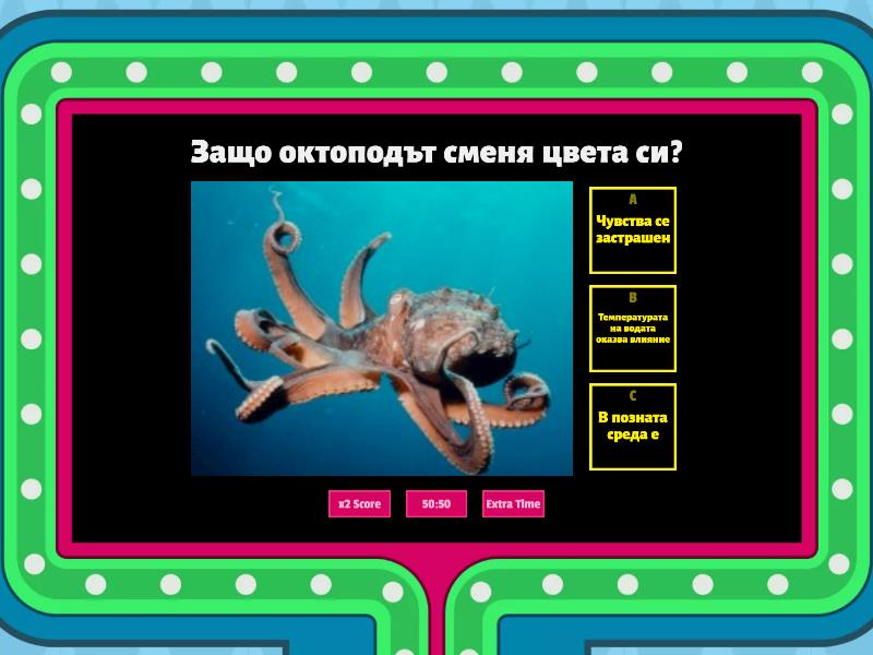 1) Защо октоподът сменя цвета си? a) Чувства се застрашен b) Температурата на водата оказва влияние c) В позната среда е 2) Къде се намира скалното образование - Улуру? a) Австрия b) Австралия c) Беларус 3) Какъв е цветът на хамелеона, когато е разгневен? a) яркожълт b) зелен c) син 4) В коя държава се среща най-често цветето каузонис? a) Япония b) Индия c) Австралия 5) Какво влияе за смяната на цвета на Peugeot RCZ? a) Tелесната температура и сърдечния пулс на шофьора b) Tемпературата навън  c) Скоростта на автомобила 6) Какъв цвят хортензии не могат да променят цвета си? a) син b) розов c) бял