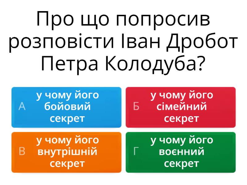 1)  Про що попросив розповісти Іван Дробот Петра Колодуба? a) у чому його бойовий секрет b) у чому його сімейний секрет c) у чому його внутрішній секрет d) у чому його воєнний секрет 2) Ким був Колодуб до війни? a) трактористом b) комбайнером c) садівником d) агрономом 3) «Грізний голос народу» - це a) Платон b) Савка c) Колодуб d) Дробот 4) «Казна-що, не люди» - це: a) німці b) бійці c) полковники d) селяни 5) Річними духами в оповідання названо: a) дідів b) бійців c) рибалок d) селян 6) Хто з героїв міг вийти з будь-якого пекла? a) Платон b) Савка c) Дробот d) Колодуб 7) Про події якої пори року згадує Колодуб? a) зими b) весни c) літа d) осені 8) Що не давало схожості Савки зі святим Миколою-угодником? a) кепка b) чоботи c) фуфайка d) Г наявність човна 9) У чому дід Платон вбачав причину відступу? a) бійці боялися   b) бійці не вміли битися   c) бійці були погано озброєні d) бійці не слухали командирів 10) У кого з героїв «душа мала»? a) Колодуба b) Дробота c) Троянди d) Платона 11) За що був вдячний Колодуб Платону? a) перевіз на інший берег ріки   b) сильно сварив   c) не пожалів d) за підтримку 12) Кого перед бійцями Платон ставив за приклад? a) Колодуба b) Дробота c) Левка d) Троянду
