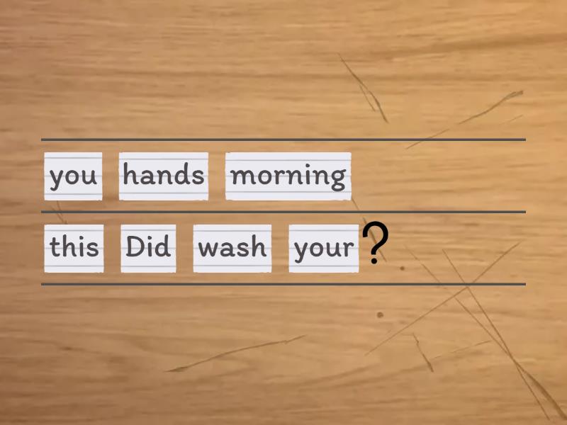 Did you wash your hands this morning?, Did you go to school yesterday? , Did you buy a toy in the shop?, Did you water the plants?, Did you listen to the music?, Did you stratch your back?, Did you ride a bike yesterday?, Did you play with dolls last evening?, Did your mum ask you for help?, Did Steve go to school last Monday?, Did your father work last Saturday?,