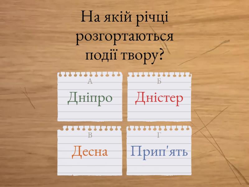 1) На якій річці розгортаються події твору? a) Дніпро b) Дністер c) Десна d) Прип'ять 2) Хто розповідає про пам'ятну зустріч із дідами-рибалками? a) Петро Колодуб b) Іван Дробот c) Іван Овчаренко d) Платон Півторак 3) Про яку подію розповідає командир? a) наступ військ на сході b) відступ військ на схід c) запеклий бій d) як їх брали у полон 4) Ким був до війни Петро Колодуб? a) садівником b) бригадиром c) водієм d) художником 5) Якими словами зустрів бійців Платон Півторак? a) "Чого це ви тікаєте?" b) "Чи боїтеся ви смерті?" c) "Смерті боятися не потрібно" d) "Тікаєте, бісові сини?" 6) На яке паскудство, за словами діда, доводиться дивитися народові? a) бомбардування b) смерть c) відступ d) гарматну стрілянину 7) Які почуття охопили Колодуба, коли діди перевозили їх через річку? a) сум, хвилювання, страх b) страх, відчай, біль c) сором, розпач, жаль d) переживання, ненависть, відчай 8) На кого був схожий дід Савка? a) на Ісуса b) на Миколу-угодника c) на Святого Гавриїла d) на Святого Михаїла 9) Що хотів зробити Петро Колодуб після війни? a) розказати про перемогу у боях b) привезти гостинців діду Платону c) поклонитись діду Платону в ноги за науку d) показати діду свої медалі 10) Під час спогадів капітана Колодуба про перші дні війни бійців охоплювало почуття... a) єдиної сім'ї b) страху c) зацікавленості d) відчаю 11) Слова "Душа, хлопче, вона буває всяка. Одна глибока і бистра, як Дніпро, друга - як Десна, ось третя - як калюжа..." належать? a) Петрові Колодубу b) Борисові Троянді c) дідові Савці d) дідові Платону 12) Платон Півторак і дід Савка загинули... a) перевернувши човен із фашистами b) захищаючи човен із фашистами c) потрапивши під ворожі кулі d) коли перевозили зброю для військових