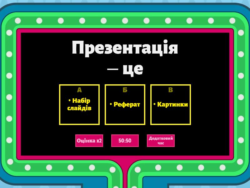 1) Презентація – це a) • Набір слайдів b) • Реферат c) • Картинки 2) Програма, яка використовується для створення комп’ютерних презентацій a) • Microsoft Word b) • Microsoft Power Point c) • Microsoft Excel 3) Основні об’єкти презентації a) • Ігри b) • Графічні зображення c) • Посилання d) •Таблиці e) •Макроси f) •Аудіо та відеофайли 4) Вкажіть способи показу слайдів a) З початку b) В довільному порядку c) З даного d) З нового e) З існуючого 5) Презентація в середовищі MS Power Point зберігається з розширенням a) ppt b) exe c) ppl d) txt e) doc 6) Комп’ютерна презентація складається зі... a) спрайтів b) слайдів c) сайтів d) аркушів e) листів 7) Вибери імена файлів, які створено за допомогою редактора презентацій. a) Весна.png b) Зима.doc c) Школа.pps d) Погода.ppt 8) Яку назву має редактор презентацій? a) Microsoft Word b) Paint c) Microsoft Power Point d) Scratch e) Tux Paint 9) Слайд це –  a) безліч кадрів b) три кадри на екрані монітора c) два кадри на екрані монітора d) один кадр на екрані монітора e) дві картинки на екрані 10) Макет слайда містить a) тільки текст b) тільки відео c) поля форматування, розташування та покажчика місця заповнення для всього вмісту, який відображається на слайді d) спеціальне поле для таблиці e) спеціальне місце для розміщення фігур