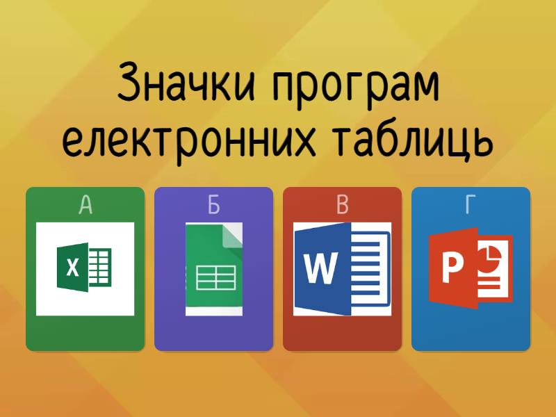1) Електронні таблиці мають назви a) Microsoft Excel, Таблиці b) Microsoft Word, Таблиці c) Microsoft Power Point, Таблиці 2) Значки програм електронних таблиць a) b) c) d) 3) Електронна таблиця складається з  a) чистого білого аркуша b) стовпців та рядків 4) На перетині стовпця і рядка розміщена a) таблиця b) прямокутник c) клітинка 5) Кожна клітинка має a) адресу b) ім'я 6) У клітинки електронної таблиці вводять вводять  a) лише текст b) лише числа c) дані 7) Оберіть рядок з правильними адресами клітинок a) A7, В10, D11, 8C b) А8, 12, D6, C3 c) A9, В10, D11, G23 8) Текстові дані в таблиці вирівнюються за a) лівим краєм b) правим краєм 9) Числові дані в таблиці вирівнюються за a) лівим краєм b) правим краєм 10) Адреса клітинки складається з a) імені стовпця та номера рядка b) номера стовпця та імені рядка 11) Чи можна зробити збільшити ширину стовпця або рядка? a) так b) ні 12) Для видалення неправильних даних з клітинки використовують a) Delete b) Enter c) Пробіл