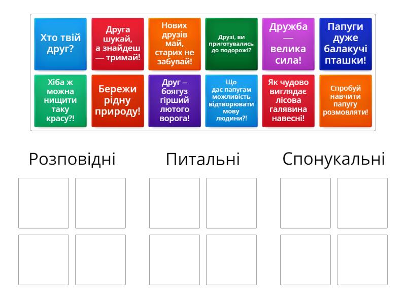 Розповідні: Папуги дуже балакучі пташки!, Як чудово виглядає лісова галявина навесні!, Дружба — велика сила!, Друг – боягуз гірший лютого ворога!, Питальні: Що дає папугам можливість відтворювати мову людини?!, Хіба ж можна нищити таку красу?!, Друзі, ви приготувались до подорожі?, Хто твій друг?, Спонукальні: Спробуй навчити папугу розмовляти!, Бережи рідну природу!, Нових друзів май, старих не забувай!, Друга шукай, а знайдеш — тримай!,