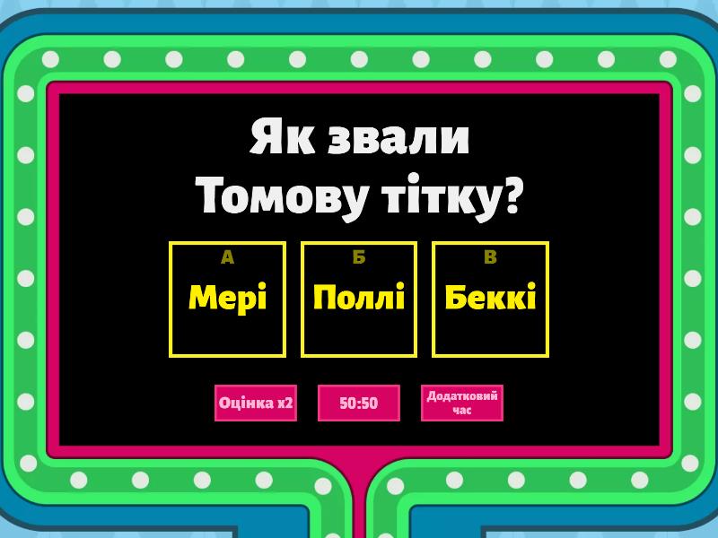 1) Як звали Томову тітку? a) Мері b) Поллі c) Беккі 2) Яку роботу дала тітка Томові суботнього ранку? a) Прибрати в будинку b) Зробити уроки c) Пофарбувати паркан 3) Брата Тома звали a) Сід b) Джим c) Гек 4) Хто був найкращим другом Тома? a) Сід b) Беккі c) Джим d) Геккльбері Фінн 5) Що було в руках у Гека Фіна, коли Том зустрів його біля школи? a) М'яч b) Каміння c) Здохлий кіт 6) Куди Том з Геком пішли уночі? a) До щколи b) На цвинтар c) До лісу 7) Свідками чого стали хлопці на цвинтарі? a) Вбивства лікаря Робінсона b) Вбивства Мефа Поттера c) Вбивства індіанця Джо 8) Кого звинуватили у вбивстві лікаря? a) Індіанця Джо b) Тома і Гека c) Мефа Поттера 9) Куди відправились Том, Гек і Джо Гарпер a) У печеру b) У в'язницю c) На безлюдний(Джексонів) острів 10) Як звали дівчинку, яка подобалась Томові? a) Поллі b) Мері c) Беккі 11) Де заблукали Том із Беккі? a) У печері b) У лісі c) На безлюдному острові 12) Яка їжа залишилась у Тома з Беккі? a) Окраєць хліба b) "Весільний пиріг" c) Яблуко