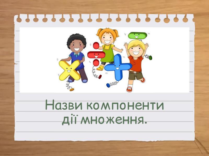 Назви компоненти дії додавання. - Пеший доданок, другий доданок, сума., Назви компоненти дії віднімання. - Зменшуване, від'ємник, різниця., Назви компоненти дії множення. - Перший множник, другий множник, добуток., Назви компоненти дії ділення. - Ділене, дільник, частка.,