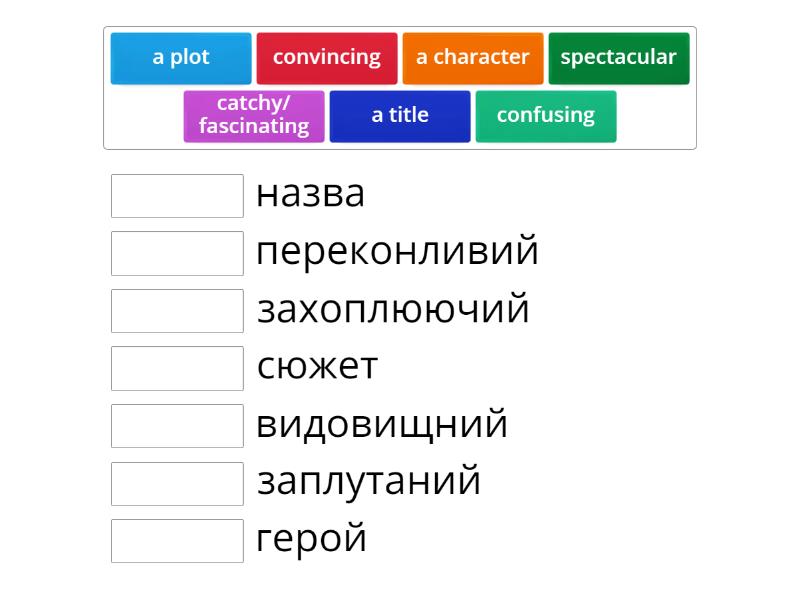a character - герой, a plot - сюжет, a title - назва, catchy/ fascinating - захоплюючий, confusing - заплутаний, convincing - переконливий, spectacular - видовищний,
