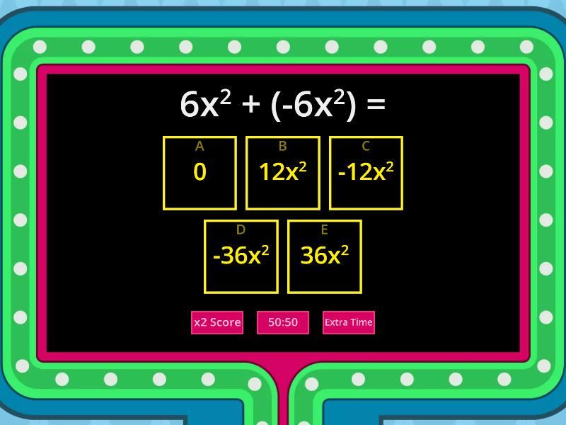 1) 6x2 + (-6x2) = a) 0 b) 12x2 c) -12x2 d) -36x2 e) 36x2 2) -3x2 + 4x2 = a) x b) -x c) -x2 d) x2 e) -7x2 3) 7x + (-2x) = a) -9x b) 9x c) 5x d) -14x e) 14x 4) -5x – (-2x) = a) -7x b) 3x c) 10x d) -10x e) -3x 5) 2x – x = a) x b) 3x c) 2 d) -2 e) -x 6) 5x3 – (-8x3) = a) 3x3 b) 13x3 c) -13x3 d) 40x3 e) -40x3 7) 4x3 multiplied by x =  a) 5x3 b) 4x2 c) 4x d) 4x4 e) 5x 8) -5x multiplied by x =  a) -5x2 b) 5x2 c) -4x2 d) 4x2 e) -4x 9) x multiplied by x =  a) 2x b) -2x c) 0 d) 2x2 e) x2 10) 2x3 / x = a) 2x b) 2/x c) 2x2 d) x2 e) x 11) 6x2 / 2x = a) 3x b) 12x c) -3x d) -12x e) x2 12) -3x3 / x = a) x2 b) -3x c) -3x2 d) -3 e) -x