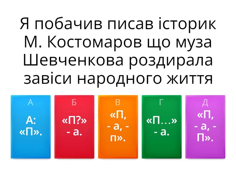 1) Я побачив писав історик М. Костомаров що муза Шевченкова роздирала завіси народного життя a) А: «П». b) «П?» - а. c) «П, - а, - п». d) «П…» - а. e) «П, - а, - П». 2) А що, коли я й справді лісова мавка запитала дівчина грайливо. a) «П, - а, - п». b) А: «П!» c) «П?» - а. d) «П», - а. 3) Бідна дівчино сказав Захар що я можу тобі порадити a) «П?» - а. b) «П!» - а. c) «П! - а. - П?" d) А: «П!» e) «П, - а, - п?». 4) Чого батько журяться подумав він чи того що нездужають, чи того, що немає грошей викупити мамині чоботи a) «П? - а, - п?» b) А: «П!» c) «П?» - а. d) «П!» - а. e) «П? - а. - П?» 5) Насуплю я брови, говорить зима, і вітер з морозом повіє. a) «П, - а, - п». b) «П, - а. - П». c) А: «П». d) «П?» - а. 6) Немає в світі нічого сильнішого за людину тихо говорить він Івану Івановичу, гріючись біля вогню a) А : «П» b) «П», -а. c) «П»,- а: «П». d) «П?» - а. 7) Гайда, хлопці шепнув дід і, вийшовши з кущів, голосно кахикнув кахи-кахи a) «П,- а: П». b) «П?» - а. c) А : «П» d) "П",- а: "П". e) «П, - а. - П». 8) Та й дивлюсь нишком, чи не пізнаю його де, коли чую Ой мені лишенько жахнулася Катря обік мене. a) А : «П!» - а. b) А : «П» c) «П»,- а: «П». d) «П», -а. 9) Скільки кілометрів до міста запитав спутник a) «П»,- а: «П». b) «П?» - а. c) «П», -а. d) А : «П!» 10) На моє запитання коли прийде потяг ніхто не міг відповісти a) А : «П» b) «П»,- а: «П». c) А : «П?» d) А : «П?» - а. 11) Ей Хівре Солопій сказав їй не сварися a) А : «П» b) «П,- а: П». c) «П, - а, - п». d) «П, - а. - П». 12) Спасибі діду. Більше не будемо красти у вас яблука дзвінко сказав Задьора і озирнувшись додав Дамка! На місце a) «П,- а: П!». b) «П,- а.- П!». c) «П,- а, - п!». d) «П,- а, - П». e) «П,- а: п!».