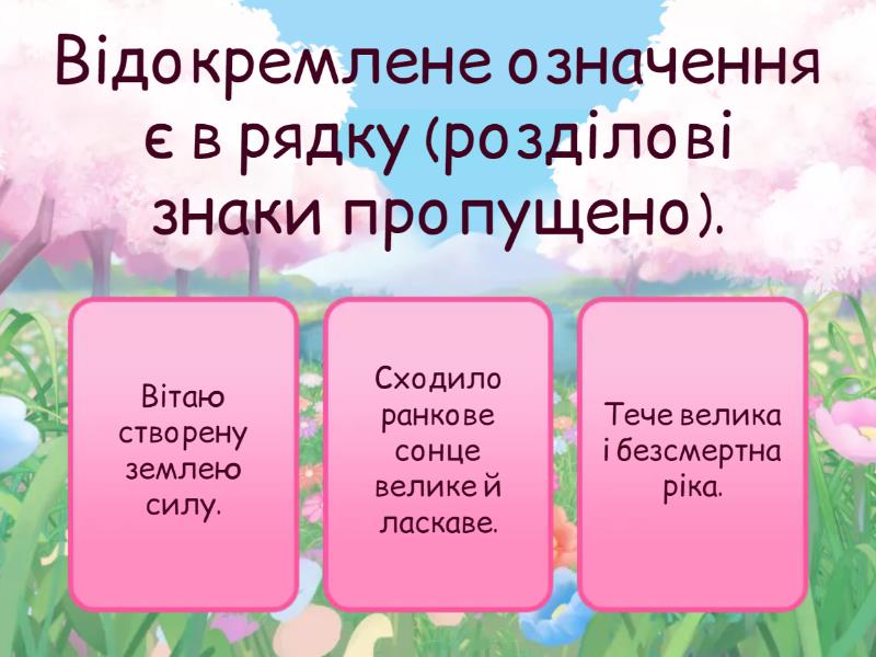 1) Відокремлене означення є в рядку (розділові знаки пропущено). a) Вітаю створену землею силу. b) Сходило ранкове сонце велике й ласкаве. c) Тече велика і безсмертна ріка. 2) Відокремленого означення НЕМАЄ в рядку (розділові знаки пропущено). a) Я йду в простори чулий і тривожний. b) Різдвяна ніч кована зорями стояла в степу. c) Чисте прозоре повітря ані ворухнеться. 3) Означення НЕ потрібно виділяти комами в рядку a) Утомлені довгою прогулянкою ми повернулися назад. b) Утомлені довгою прогулянкою діти повернулися назад. c) Діти втомлені довгою прогулянкою повернулися додому. 4) Правильно розставлені розділові знаки в реченні a) Стояла темна ніч, холодна, вітряна. b) Стояла темна ніч холодна, вітряна c) Стояла, темна, ніч, холодна, вітряна 5) Правильно розставлені розділові знаки в реченні a) Сашко змалку любив гуляти в дубовому лісі, такому стародавньому й загадковому. b) Сашко змалку любив гуляти в дубовому лісі- такому стародавньому й загадковому. c) Сашко змалку любив гуляти в дубовому лісі такому стародавньому й загадковому. 6) Правильно розставлені розділові знаки в реченні a) Худа, у чорному вбранні, вона була майже непомітною в юрбі. b) На стежці лежала загублена кимось хустина, в білий горошок. c) Юлю мучило непереборне бажання, поділитися секретом з подругою.