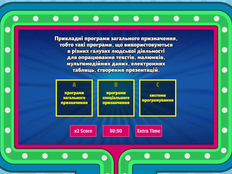 1) Прикладні програми загального призначення, тобто такі програми, що використовуються в різних галузях людської діяльності для опрацювання текстів, малюнків, мультимедійних даних, електронних таблиць, створення презентацій. a) програми загального призначення b) програми спеціального призначення c) системи програмування 2) Програми для опрацювання даних у певній галузі діяльності, на конкретному підприємстві, в організації, фірмі або їх підрозділі a) програми загального призначення b) програми спеціального призначення c) системи програмування 3) Програми, призначені для створення програм з використанням мов програмування a) програми загального призначення b) програми спеціального призначення c) системи програмування 4) Вкажіть на програми графічний редактор a) b) c) d) 5) Вкажіть на програми роботи з текстами a) b) c) d) 6) Вкажіть на програми редактора презентацій a) b) c) d) 7) Вкажіть на програми середовища програмування a) b) c) d) 8) Прикладна програма — це будь-яка конкретна програма, що сприяє розв’язанню якої-небудь задачі в межах даної проблемної галузі. a) так b) ні
