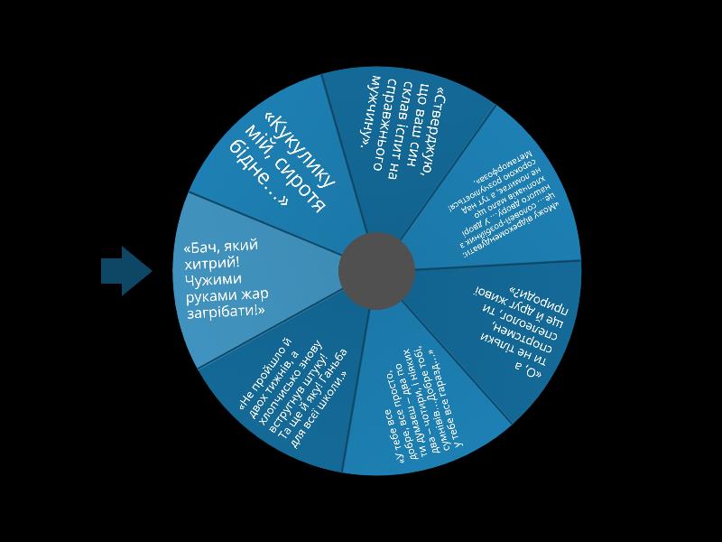 «Кукулику мій, сиротя бідне…», «Стверджую, що ваш син склав іспит на справжнього мужчину»., «Можу відрекомендувати: це… соловей-розбійник з нашого двору… У дворі хлопчаків мало що не ломигає, а тут над сорокою розчулюється! Метаморфоза»., «О, а ти не тільки спортсмен, спелеолог, ти ще й друг живої природи?», «У тебе все добре, все просто, ти думаєш – два по два – чотири, і ніяких сумнівів…Добре тобі, у тебе все гаразд…», «Не пройшло й двох тижнів, а хлопчисько знову встругнув штуку! Та ще й яку! Ганьба для всєї школи.», «Бач, який хитрий! Чужими руками жар загрібати!».