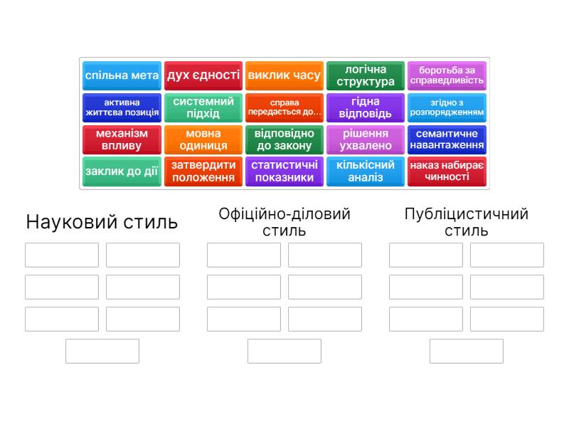 Науковий стиль: системний підхід, механізм впливу, кількісний аналіз, мовна одиниця, логічна структура, статистичні показники, семантичне навантаження, Офіційно-діловий стиль: відповідно до закону, рішення ухвалено, справа передається до…, згідно з розпорядженням, затвердити положення, наказ набирає чинності, Публіцистичний стиль: дух єдності, активна життєва позиція, гідна відповідь, виклик часу, заклик до дії, боротьба за справедливість, спільна мета,