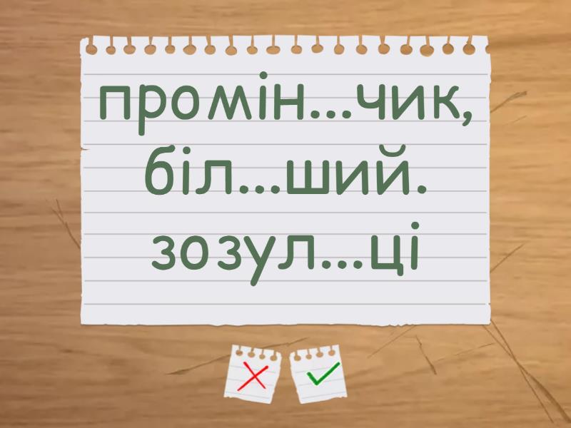 мистец...кий, учител...ство, камін...чик - камінчик, малесен...кий, одягаєт...ся, мен...ший - менший, він...чати, запоріз...кий, жен...шень - вінчати, дивуєт...ся, бояз...кий, узгод...те - боязкий, матусен...ці, гребін...чик, азовс...кий - гребінчик, урал...ський, куз...ня, Ман...чжурія - кузня, Сорочин...ці, їдал...ня, слиз...кий - Сорочинці, Пол...ща, Гуцул...щина, Уман...щина - Уманщина, тон...ший, молот...ба. різ...блений - тонший, чотир...ма, брун...ці, стежин...ці - стежинці, промін...чик, біл...ший. зозул...ці - промінчик, виход...те, купал...ський, корін...чик - корінчик,