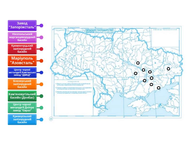 Криворізький залізорудний басейн, Кременчуцький залізорудний басейн, Білозерський залізорудний басейн, Кам’яновугільний басейн (Донбас), Нікопольський марганцеворудний басейн, Центр чорної металургії Кам'янське завод "ДМКД", Центр чорної металургії Дніпро завод "Євраз", Маріуполь "Азовсталь", Завод "Запоріжсталь".