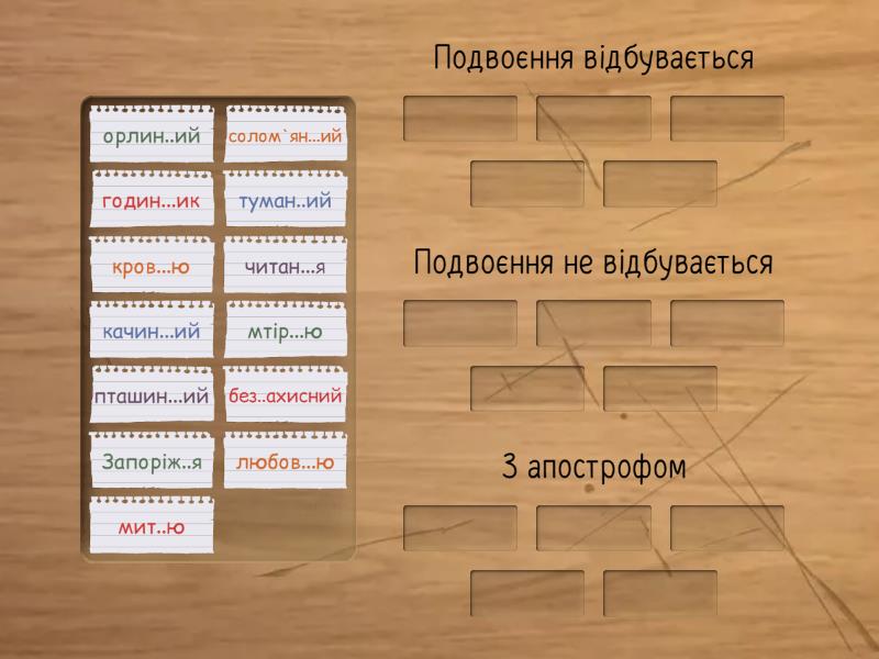 Подвоєння відбувається: без..ахисний, туман..ий, годин...ик, читан...я, Запоріж..я, Подвоєння не відбувається: орлин..ий, качин...ий, пташин...ий, солом`ян...ий, мит..ю, З апострофом: любов...ю, кров...ю, мтір...ю,