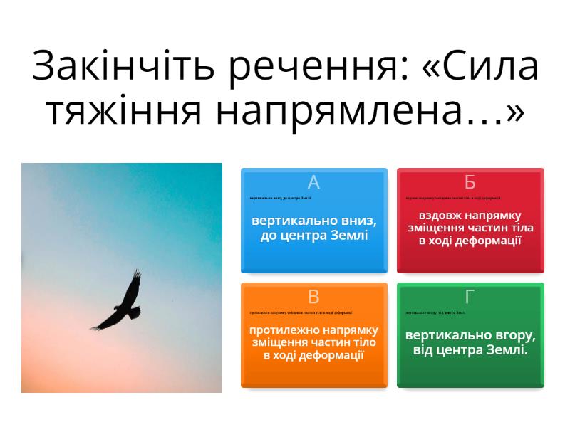 1) Учень стоїть біля дошки. На яке тіло діє сила тяжіння учня? a) На опору b) На Землю c) На дошку d) На учня 2) Закінчіть речення: «Деформації називаються пружними, якщо після припинення дії сили тіло…»  a) руйнується. b) повністю відновлює форму. c) частково відновлює форму. d) продовжує змінювати форму. 3) Формула закону Гука: a) x = k · F пруж; b) F пруж = k / х c) F пруж = k · x d) F пруж = х / k 4) Закінчіть речення: «Сила тяжіння напрямлена…» a) вертикально вгору, від центра Землі. b) вздовж напрямку зміщення частин тіла в ході деформації c) протилежно напрямку зміщення частин тіло в ході деформації d) вертикально вниз, до центра Землі 5) Формула сили тяжіння: a) F тяж = g · m b) F тяж= g / m c) F тяж= m / g 6) Одиниці вимірювання коефіцієнта пропорційності k (жорсткості тіла) в законі Гука... a) м b) Н · м c) Н/м d) Н/кг 7) Прилади для вимірювання сили називають ... a) терезами b) манометрами c) динамометрами 8) Сила пружності є проявом дії ... a) всесвітнього тяжіння b) міжмолекулярних сил c) притягання Землі 9) Сила пружності - a) це сила, яка виникає під час деформації тіла і напрямлена протилежно напрямку зміщення частин цього тіла в ході деформації. b) це сила, яка виникає під час деформації тіла і напрямлена вздовж напрямку зміщення частин цього тіла в ході деформації. 10) Видовження - це... a) фізична величина, яка характеризує деформації розтягнення та стиснення і дорівнює зміні довжини тіла в результаті деформації.  b) фізична величина, яка характеризує деформації розтягнення та стиснення і дорівнює довжині тіла 11) Якою є маса тіла, якщо його вага дорівнює 600 Н? (g = 10 Н/кг) a) 600 кг b) 6000 кг c) 60 кг d) 6 кг