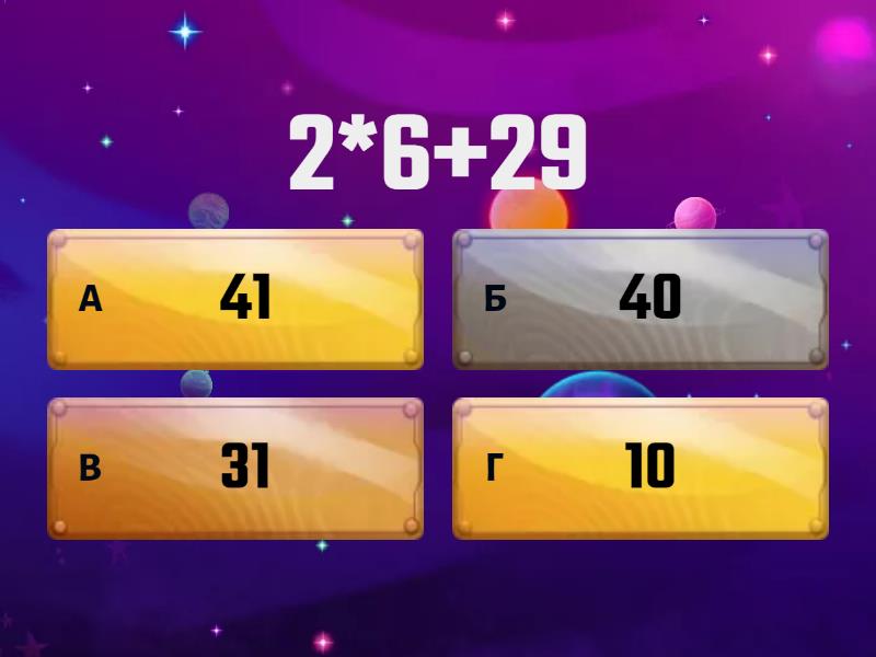 1) 2*6+29 a) 41 b) 40 c) 31 d) 10 2) 2*9+15 a) 23 b) 33 c) 18 d) 17 3) 2*7-7 a) 7 b) 10 c) 8 d) 6 4) 2*8+28 a) 34 b) 43 c) 44 d) 6 5) 2*10-4 a) 16 b) 17 c) 19 d) 36 6) 3*10-16 a) 17 b) 15 c) 14 7) 2*9-9 a) 10 b) 9 c) 8 8) 2*8-9 a) 7 b) 8 c) 6