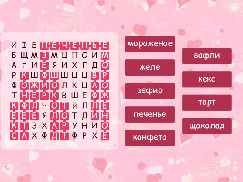 торт - торт, конфета - конфета, печенье - печенье, вафли - вафли, мороженое - мороженое, кекс - кекс, желе - желе, шоколад - щоколад, зефир - зефир,