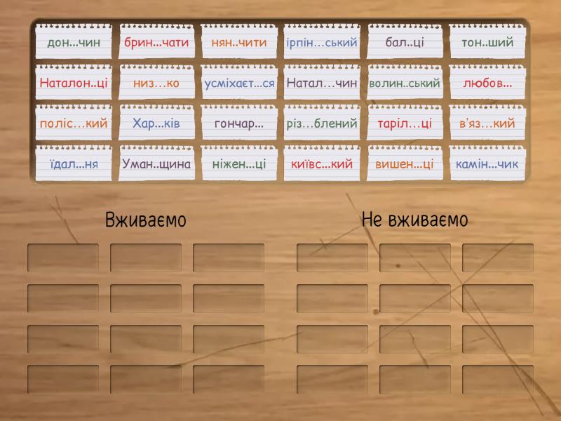 Вживаємо: низ…ко, різ…блений, поліс…кий, нян..чити, вишен...ці, брин...чати, усміхаєт...ся, їдал...ня, ніжен...ці, київс...кий, дон...чин, Наталон..ці, Не вживаємо: таріл…ці, в’яз…кий, Натал…чин, камін...чик, ірпін…ський, Хар...ків, любов..., бал..ці, тон..ший, Уман..щина, волин..ський, гончар...,