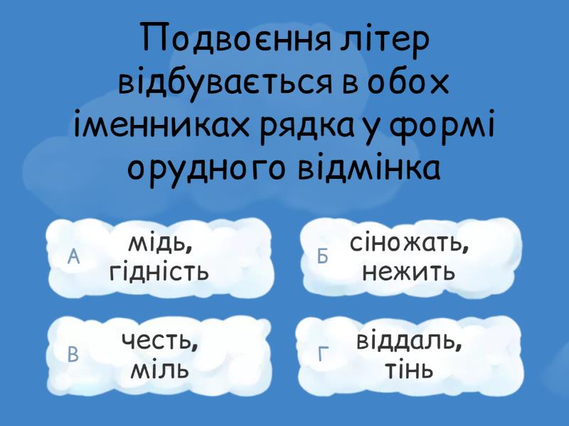 1) Подвоєння літер відбувається в обох іменниках рядка у формі орудного відмінка a) мідь, гідність b) сіножать, нежить c) честь, міль d) віддаль, тінь 2) Орфографічну помилку допущено в рядку a) безліччю, мудрістю b) ясністтю, памороззю c) кіновар'ю, подорожжю d) повістю, заздрістю 3) Подвоєні літери треба писати в обох словах рядка a) гости(н/нн)ість, безсмер(т/тт)я b) попідти(н/нн)ю, ста(т/тт)ей c) ста(т/тт)ею, блаки(т/тт)ю d) пі(д/дд)аний, студе(н/нн)ий 4) Подвоєні літери треба писати в обох словах рядка a) воскресі(н/нн)я, навіже(н/нн)ий b) ві(д/дд)звеніти, освяче(н/нн)ий c) передгро(з/зз)я, во(з/зз)'єднання d) бездога(н/нн)ий, щедріс(т/тт)ю 5) Подвоєні літери треба писати в обох словах рядка a) сувере(н/нн)ий, стара(н/нн)ий b) о(б/бб)ризкати, замрія(н/нн)о c) верхові(т/тт)я, Берес(т/тт)я d) блаже(н/нн)ий, попа(д/дд)я 6) Приголосні НЕ подвоюються в обох словах рядка a) екстре(н/нн)ий, благослове(н/нн)ий b) казарме(н/нн)ий, потомстве(н/нн)ий c) побукве(н/нн)ий, імени(н/нн)ик d) довгожда(н/нн)ий, екра(н/нн)ий 7) Приголосні НЕ подвоюються в обох словах рядка, ОКРІМ a) шале(н/нн)ий, мудріс(т/тт)ю b) милосер(д/дд)я, дзві(н/нн)иця c) клятве(н/нн)ий, блаже(н/нн)ий d) пореформе(н/нн)ий, індиче(н/нн)я 8) Приголосні НЕ подвоюються в обох словах рядка, ОКРІМ a) ку(т/тт)я, муче(н/нн)ик b) скатер(т/тт)ю, сви(н/нн)я c) обіця(н/нн)ий, варе(н/нн)ий d) орли(н/нн)ий, ві(д/дд)зеркалити 9) Подвоєні літери слід писати на місці пропуску в обох словах рядка a) числен..ий, неочікуван..ий b) сокровен..ий, підгрунт..я c) злиден..ий, військ...омат d) маз..ю, полонен..ий 10) Подвоєні літери слід писати на місці пропуску в обох словах рядка, ОКРІМ a) в..ічливий, узліс..я b) самовід..аність, незмін..ість c) л..яний, с..авець d) ймен..я, притишен..ий 11) Подовження приголосних відбувається у формі Ор.в. однини всіх слів рядка a) верф, паралель, подорож, мазь b) пам’ять, сіль, велич, лазур c) вуаль, буденність, суміш, папороть d) магістраль, ціль, мігрень, пастель 12) Подовження приголосних відбувається у формі Ор.в. однини всіх іменників рядка a) путь, річ, шампунь b) міць, стать, продаж c) сталь, дріб, суміш d) поміч, сіль, доповідь