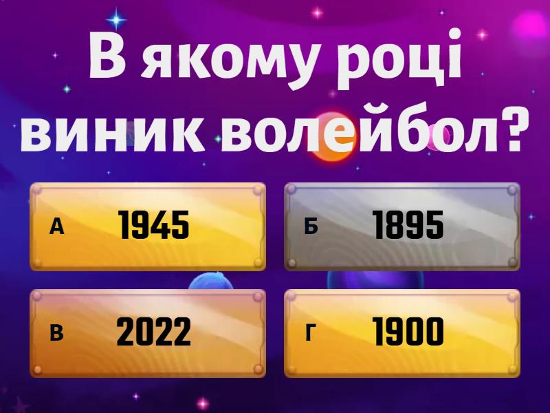 1) В якому році виник волейбол? a) 1945 b) 1895 c) 2022 d) 1900 2) Хто вважається винахідником волейболу? a) Тарас Шевченко b) Джек Горобець c) Джейм Нейсміт d) Вільям Морган 3) В якій країні виник волейбол? a) в Україні b) в США c) в Австралії d) в Японії 4) Який м'яч спочатку перекидали через сітку учні Вільяма Моргана? a) Баскетбольний b) Волейбольний c) Тенісний d) Футбольний 5) Волейбол це - a) Командний вид спорту, в який грають сферичним м'ячем дві команди по одинадцять гравців одинадцять гравців b) Командна гра з м'ячем, який закидають руками в кільце c) Командна гра з м'ячем, у якій дві команди змагаються на спеціальному майданчику, розділеному сіткою 6) На якому малюнку зображено волейбольний м'яч? a) b) c) d) 7) На якому малюнку зображено волейбольний майданчик? a) b) c) d) 8) Які розміри волейбольного майданчика? a) 30м x 40м b) 18м x 9м c) 28м x 15м d) 14м x 15м 9) Скільки гравців однієї команди може одночасно перебувати на полі під час гри у волейбол? a) 6 b) скільки завгодно c) 5 d) 11 10) Яка висота волейбольної сітки для жінок, чоловіків? a) 2м 50см, 2м 70см b) 2м 24см, 2м 43см c) 1м 80см, 1м 90см 11) В якому місті України вперше почали займатися волейболом? a) Київ b) Одеса c) Харків d) Маріуполь 12) Чи є волейбол олімпійським видом спорту? a) так b) ні