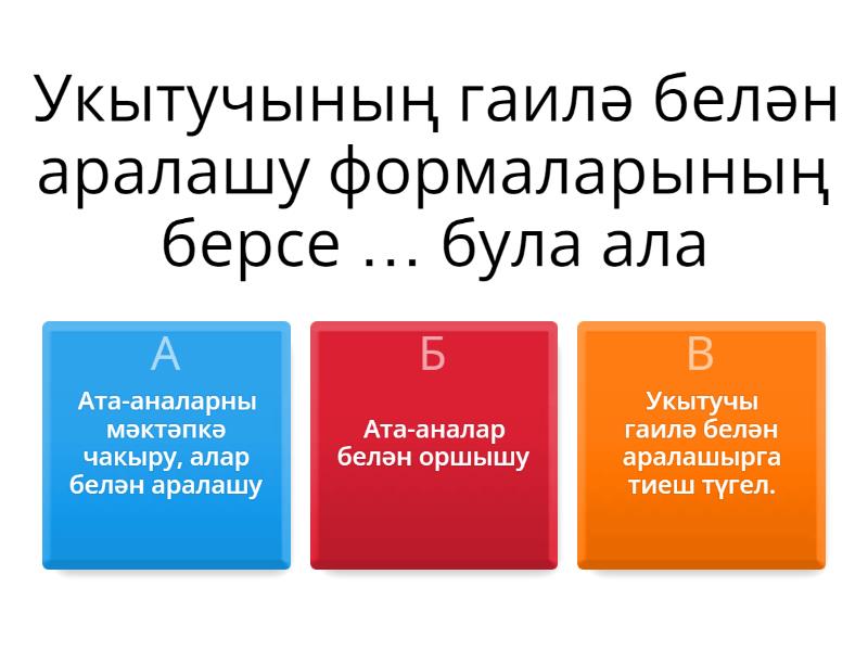 1) Укытучының гаилә белән аралашу формаларының берсе … була ала a) Ата-аналарны мәктәпкә чакыру, алар белән аралашу b) Ата-аналар белән оршышу c) Укытучы гаилә белән аралашырга тиеш түгел. 2) Коллектив эш формаларына түбәндәге вариантлар керә ала: a) Ата-аналарга ачулану, дәфтәр тикшерү, педсоветка йөрү; b) Ә) Ата-аналар жыелышы, концертлар, ачык ишекләр көне; c) Б) Расписание төзү, балаларга китап уку, балаларны ашханәгә озату. 3) "Как можно меньше вызовов в школу матерей и отцов для моральных нотаций детям, для устрашения сыновей отцовской "сильной рукой"...- и как можно больше такого духовного общения детей с родителями, которое приносит радость матерям и отцам.» сүзләрнең авторы a) К.Д. Ушинский; b) Ә) А.С. Макаренко; c) Б) В.А. Сухомлинский 4) Ата – аналар төркемнәре ... булырга мөмкин: a) ата-ана укытучы ярдәмчеләре; тәрбия эшендә ата-ана укытучының потенциаль ярдәмчеләре ;мәктәп тормышын аңламый яки аңларга теләмәүче ата-ана ; b) Ә) Мәктәп тормышын аңламый яки аңларга теләмәүче ата-ана гына бар; c) Б) Барлык ата-аналар укытучыга һәрвакыт булышып торалар. 5) Укытучының ата аналар һәм балалар белән эшчәнлеге өч төп юнәлешне үз эченә ала: a) андый юнәлешләр юк; b) Ә) ата-аналарга психологик-педагогик белем бирү,ата-аналарны укыту-тәрбия процессына җәлеп итү ,мәктәп тормышында катнашу; + c) Б) ата-аналарга психологик-педагогик белем бирмәү, мәктәп тормышында катнашу, дәфтәр тикшерү.