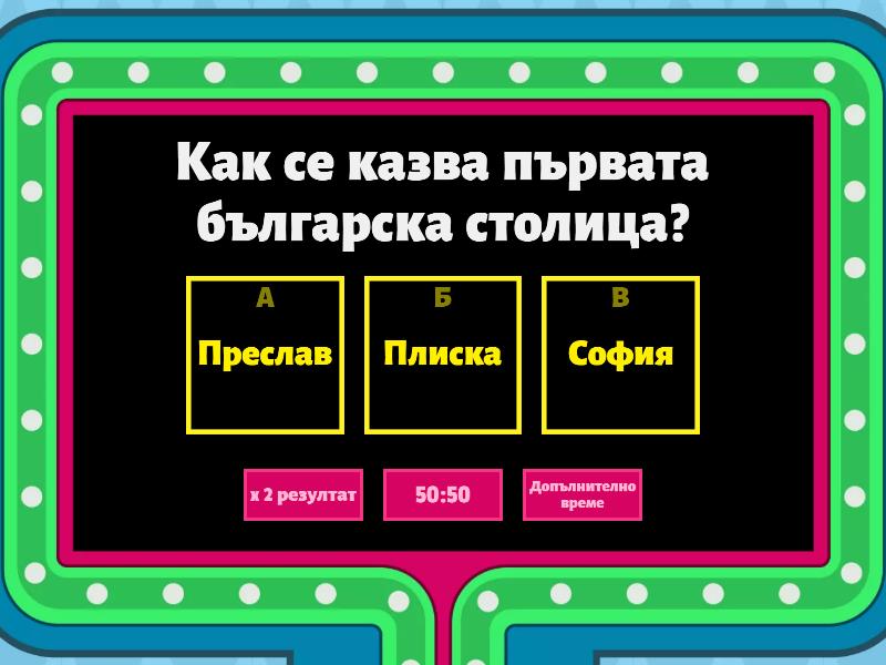1) Как се казва първата българска столица? a) Преслав b) Плиска c) София 2) Как се нарича човекът, който представлява своята държава пред други страни? a) дипломат b) свещеник c) християнин 3) При кой владетел българският народ е покръстен? a) хан Аспарух b) хан Тервел c) княз Борис 4) През коя година е покръстено българското население? a) 864 година b) 681 година c) 870 година 5) Кога е основана първата самостоятелна българска църква? a) 681 година b) 870 година c) 864 година