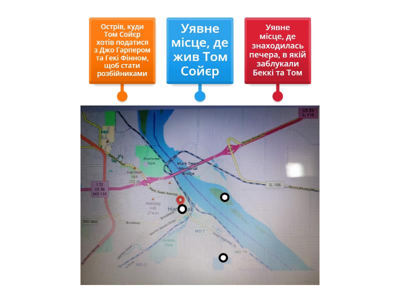 Уявне місце, де жив Том Сойєр, Уявне місце, де знаходилась печера, в якій заблукали Беккі та Том, Острів, куди Том Сойєр хотів податися з Джо Гарпером та Гекі Фінном, щоб стати розбійниками.