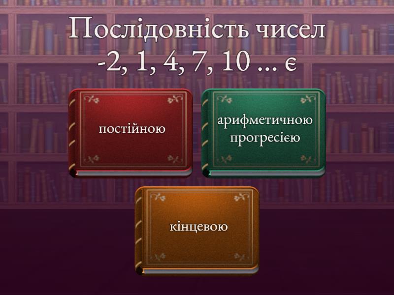1) Послідовність чисел -2, 1, 4, 7, 10 ... є a) постійною b) арифметичною прогресією c) кінцевою 2) Нехай an – арифметична прогресія. Якщо а1 = 3, d = -2, то a) a2 = 1 b) a2 = 0 c) a2 = -1 3) xn – арифметична прогресія. Якщо x1 = 3, x2 = -1, то a) d = 4 b) d = -4 c) d = 0 4) Як називається постійне число d в арифметичній прогресії ? a) різниця b) сума c) добуток 5) Арифметична прогресія виду: -2, 0, 2, 4 a) зростаюча b) спадна c) стаціонарна 6) Продовж ряд чисел: 6; 10; 14 ... a) 19 b) 18 c) 17