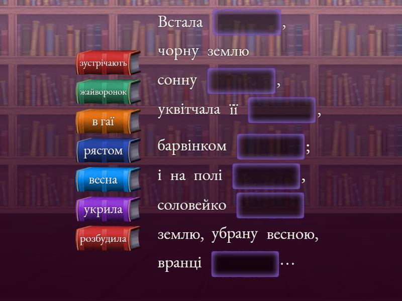 Встала ____, чорну землю сонну ____, уквітчала її ____, барвінком ____; і на полі ____, соловейко ____ землю, убрану весною, вранці ____…