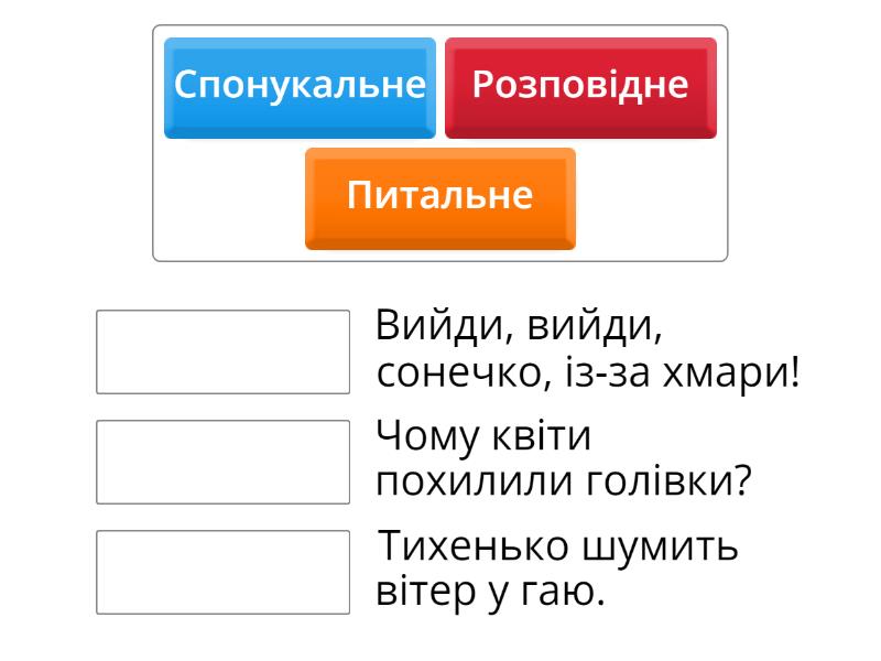 Розповідне - Тихенько шумить вітер у гаю., Питальне - Чому квіти похилили голівки?, Спонукальне - Вийди, вийди, сонечко, із-за хмари!,