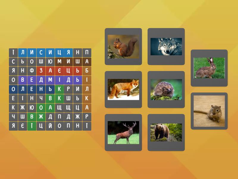 їжак, ведмідь, заєць, лисиця, миша, олень, білка, вовк,
