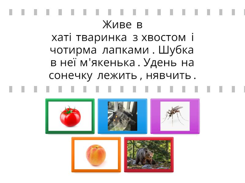 Живе в хаті тваринка з хвостом і чотирма лапками. Шубка в неї м'якенька. Удень на сонечку лежить, нявчить., Цей великий звір живе у лісі. Дуже любить мед та малину. Взимку впадає у сплячку.  Спить у своїй барлозі аж до весни., Дуже смачний, корисний, соковитий, ароматний фрукт. З нього можна зробити сік., Овоч, який всі дуже люблять. З нього можна зробити салат, додати у борщ та, навіть, у піцу., Малесенька комаха довгенький носик має. Ой, як боляче кусає.,