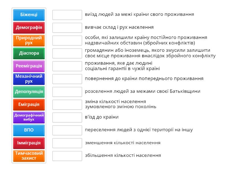Демографія - вивчає склад і рух населення, Природний рух - зміна кількості населення зумовленого зміною поколінь, Механічний рух - переселення людей з однієї території на іншу, Демографічний вибух - збільшення кількості населення, Депопуляція - зменшення кількості населення , Еміграція - виїзд людей за межі країни свого проживання, Імміграція - в'їзд до країни, Рееміграція - повернення до країни попереднього проживання, Діаспора - розселення людей за межами своєї Батьківщини, Біженці - особи, які залишили країну постійного проживання надзвичайних обставин (збройних конфліктів), Тимчасовий захист - проживання, яке дає людині соціальні гарантії в чужій країні, ВПО - громадянин або іноземець, якого змусили залишити своє місце проживання внаслідок збройного конфлікту,