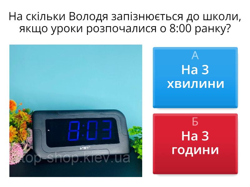 1) На скільки Володя запізнюється до школи, якщо уроки розпочалися о 8:00 ранку? a) На 3 хвилини b) На 3 години 2) Через скільки розпочнеться бабусин серіал, якщо початок о 19.00 a) 26 хв b) 34 хв c) 60 хв 3) Скільки залишилося до кінця перерви, якщо магазин відчиняється 0 13:00? a) 42 хв b) 32 хв c) 1 год 4) Через скільки продзвенить будильник, який завели на 8:00 ранку? a) 3 год b) 2 год 50 хв c) 4 год 5) Через скільки настане північ? a) 20 хв b) 40 хв c) 30 хв 6) Заняття з плавання розпочинається о 5:20 дня, продовжується 1 год 30 хв. О котрій воно закінчиться? a) 3:40 b) 17:50 c) 18:50 7) На годиннику - час початку уроку. О котрій годині розпочнеться перерва, якщо урок триває 40 хвилин? a) 10 год 40 хв b) 10 год 50 хв c) 11 год 8) Автобус відправляється о 17 год 25 хв. Скільки часу до відправлення автобуса? a) 1 год 25 хв b) 1 год 30 хв c) 2 год 30 хв d) 3 год 30 хв 9) Початок вистави - о 17. 00. Скільки часу до початку вистави? a) 3 год b) 4 год c) 3 год 30 хв d) 2 год 30 хв 10) Петрик прокидається о 7.00. Скільки часу йому залишилося поспати? a) 37 хв b) 27 хв c) 33 хв d) 1 год 27 хв 11) Від початку футбольного матчу пройшло 1 год 23 хв. О котрій годині розпочався футбольний матч? a) 11 год 23 хв b) 12 год 05 хв c) 11 год 05 хв d) 11 год 28 хв 12) Уроки в школі закінчуються о 13.10. Скільки часу до завершення уроків? a) 1 год 12 хв b) 3 год 10 хв c) 2 год 10 хв d) 2 год 12 хв