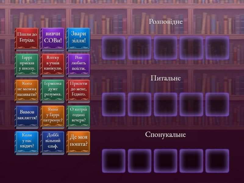 Розповідне: Гаррі приїхав у школу., Рон любить поїсти., Герміона дуже розумна., Влітку в учнів канікули., Доббі вільний ельф., Питальне: Кого не можна називати?, Коли у нас квідич?, Який у Гаррі патронус?, О котрій годині вечеря?, Де моя пошта?, Спонукальне: вивчи СОВи!, Пішли до Геґріда., Звари зілля!, Вимов закляття!, Прилети до мене, Гедвіґо.,