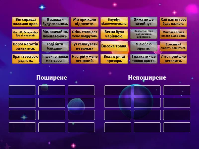 Поширене: Карпатські гори надзвичайно дивовижні., Осінь стала для мене подругою., Хай життя твоє буде казкою., Літо прийшло веселити., Ноутбук відремонтовано., Вода в річці прозора., Настрій у мене весняний., Я завжди буду сильним., Миколка почав читати дуже рано., Ми приїхали відпочити., Тут галасувати не можна, Висока трава., Непоширене: Зима лише хазяйнує., Інше - то тільки миттєвості., Ми, звичайно, помиляємось., Весна була чарівною., Годі бити байдики., Я люблю мріяти., І плакати - це також щастя., Брехливий любить божитися., Настрій, без сумніву, був зіпсований., Він справді наламав дров., Брат із сестрою радіють., Ворог не хотів здаватися.,