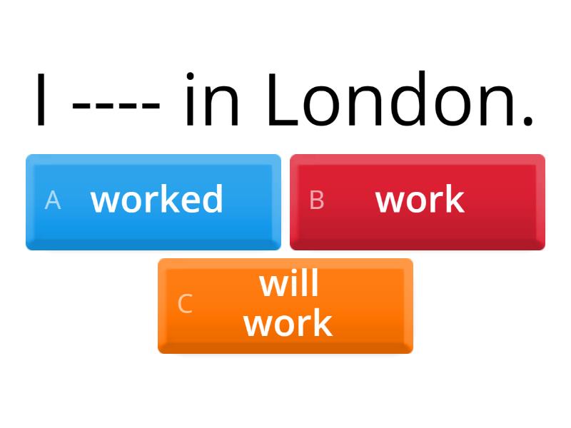 1) I ---- in London. a) worked b) work c) will work 2) My cousin ---- at University last year. a) is b) go c) was 3) We ---- to France a month ago. a) went b) go c) was 4) I --- do my homework in the evening today.  a) will do b) did 5) She ---- go to the cinema tomorrow. a) will go b) go c) went 6) We ---- to the park yesterday. a) goed b) go c) went 7) I --- never late for school. a) is b) was c) am 8) My parents --- at home last Sunday. a) are b) were c) was 9) They ------ an essay tomorrow.  a) write b) were c) will write 10) My sister always ---- "good morning" to me. a) says b) say 11) Our grandmother ---- an apple pie every Saturday. a) will make b) makes c) is 12) British people ----- sunny weather to rainy weather. a) prefer b) preferred 13) They ------ to their new house next week. a) go b) went c) will go 14) I ---- born in September. a) am b) were c) was 15) My grandpa ------ 65 years ole next year. a) will b) will be c) was 16) It ---- very cold in Russia in winter.  a) was b) are c) is 17) It ---- very cold in Russia last winter. a) was b) are c) is 18) My uncle sometimes ---- in the park. a) runs b) run c) will run 19) My sister and I ---- in the sea last summer. a) swimming b) swam c) swim 20) ---- your sister older than you? a) was b) are c) is 21) ---- they in the library two hours ago? a) are b) were c) is 22) Mary --- in my class last year. a) is b) were c) was