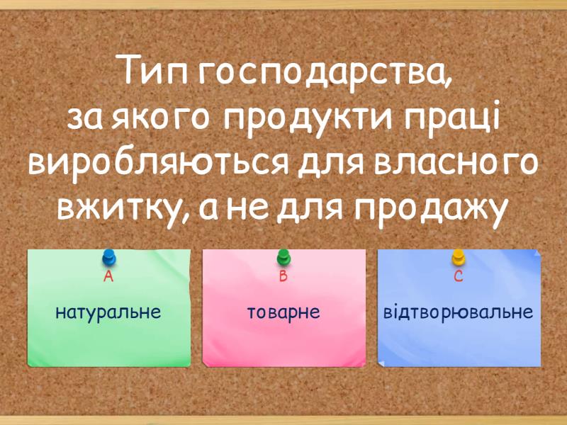 1)  Тип господарства, за якого продукти праці виробляються для власного вжитку, а не для продажу  a) натуральне b) товарне c) відтворювальне  2) Привласнювальне господарство - тип господарства при якому a) люди споживали готові продукти природи: впольовували диких тварин, збирали їстівні рослини та плоди, рибалили. b)  людина почала сама вирощувати рослини і тварин, виготовляти різноманітні предмети побуту (посуд, тканини, меблі тощо) c) людина виготовляла товари на продаж з метою отримання прибутків 3)  Відтво́рююче господарство - тип господарства при якому a) людина збирала різноманітні їстівні рослини, плоди, ягоди тощо і полювала на тварин і птахів b)  люди споживають продукти, створені власне ними: хліб, вирощені овочі та фрукти, м'ясо та молоко свійської худоби. c)  людина виготовляла товари на продаж з метою отримання прибутків 4) До відтворюючого господарства відносяться: a) полювання b) землеробство c) скотарство d) збиральництво e) рибальство f) ремесло 5) До привласнюючого господарства відносяться: a) полювання b) землеробство c) скотарство d) збиральництво e) рибальство f) ремесло 6) Головною метою якого господарства є отримання прибутку? a) ринкового b) натурального