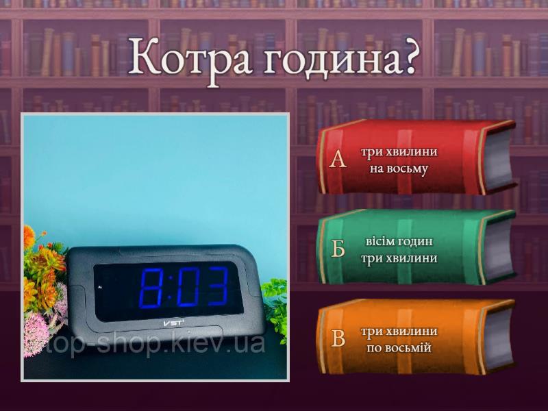 1) Котра година? a) три хвилини на восьму b) вісім годин три хвилини c) три хвилини по восьмій 2) Котра година? a) тридцять чотири хвилини до сьомої b) двадцять шість на сьому c) шість годин двадцять шість хвилин 3) Котра година? a) двадцять вісім хвилин до дванадцятої b) дванадцята година двадцять вісім хвилин c) двадцять вісім на дванадцять 4) Котра година? a) п'ята година b) п'ять годин c) рівно п'ята година 5) Котра година? a) тридцять хвилин до дванадцятої b) одинадцять годин тридцять хвилин c) пів на дванадцяту 6) Котра година? a) п'ять годин двадцять хвилин b) двадцять хвилин на шосту c) двадцять хвилин на п'яту 7) Котра година? a) десять хвилин на одинадцять годин b) десять хвилин на одинадцяту c) десять хвилин після десятої 8) Котра година? a) без п'яти хвилин третя b) за п'ять хвилин до третьої c) п'ять хвилин до третьої 9) Котра година? a) пів на першу b) тринадцять годин тридцять хвилин c) тринадцята година тридцять хвилин 10) Котра година? a) без двадцяти семи хвилин сьома b) за двадцять сім хвилин сьома c) тридцять три хвилини по шостій 11) Котра година? a) дванадцять годин двадцять вісім хвилин b) двадцять вісім хвилин до першої c) двадцять вісім хвилин на першу 12) Котра година? a) десять годин п'ятдесят вісім хвилин b) за дві хвилини одинадцята c) за дві хвилини до одинадцятої