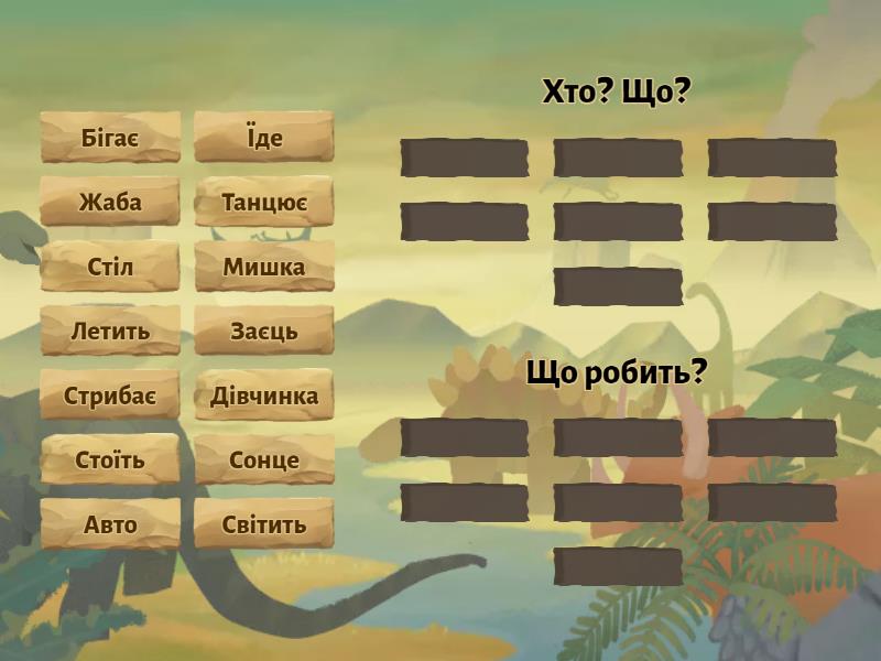 Хто? Що?: Заєць, Авто, Сонце, Дівчинка, Жаба, Стіл, Мишка, Що робить?: Бігає, Їде, Летить, Світить, Танцює, Стрибає, Стоїть,