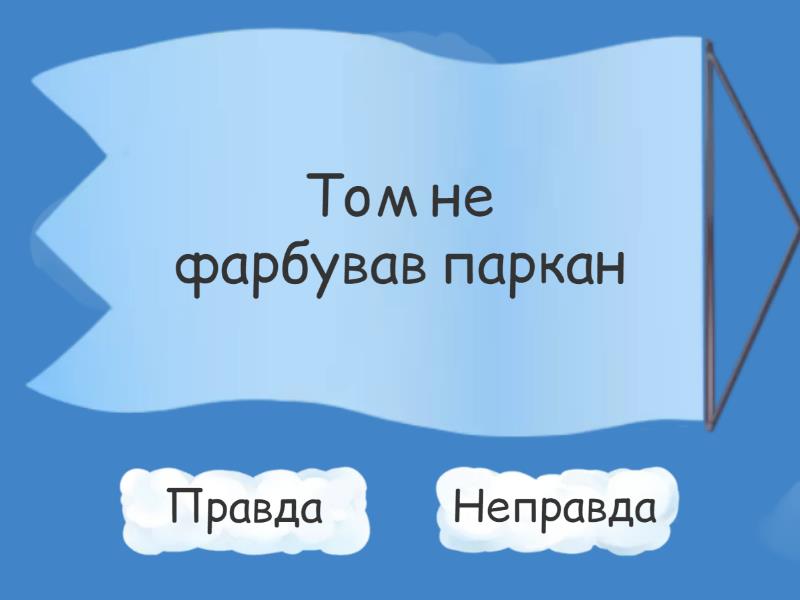 Правда: Том не фарбував паркан, Гек Фінн жив у бочці, Том не любив ходити до школи, Том не виховувався у сім'ї з мамою і татом., Тома виховувала тітка Поллі, Тітка Поллі покарала Тома фарбуванням паркану, Томові подобалась Беккі, Гек і Том вночі ходили на кладовище, Сід - це брат Тома, Неправда: Том самотужки пофарбував увесь паркан, Том обожнював школу, Гек жив з мамою і татом, Тітка ніколи не карала Тома, Том ніколи не бешкетував, Том завжди вчив старанно уроки, Гек і Том не були найкращими друзями, Том жив у Ганнібалі, Марк Твен - справжнє ім'я автора повісті "Пригоди Тома Соєра",
