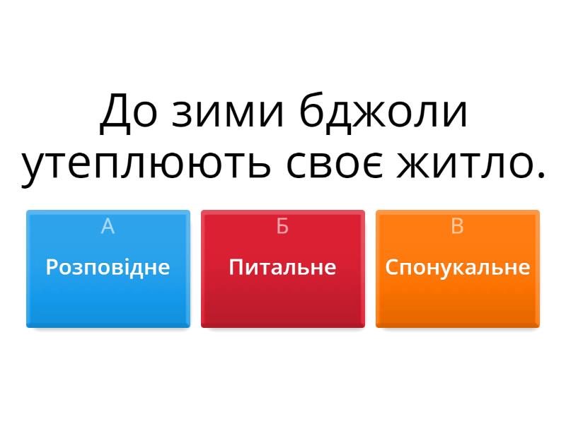 1) До зими бджоли утеплюють своє житло. a) Розповідне b) Питальне c) Спонукальне 2) Мама приготувала смачну вечерю. a) Питальне b) Розповідне c) Спонукальне 3) Не руйнуйте мурашників! a) Розповідне b) Питальне c) Спонукальне 4) Чому хмарка плаче? a) Розповідне b) Питальне c) Спонукальне 5) Які звірі міняють свою літню шубку? a) Розповідне b) Питальне c) Спонукальне 6) Діти, бережіть природу! a) Розповідне b) Питальне c) Спонукальне 7) Де ти, сонечко, гуляло? a) Розповідне b) Питальне c) Спонукальне