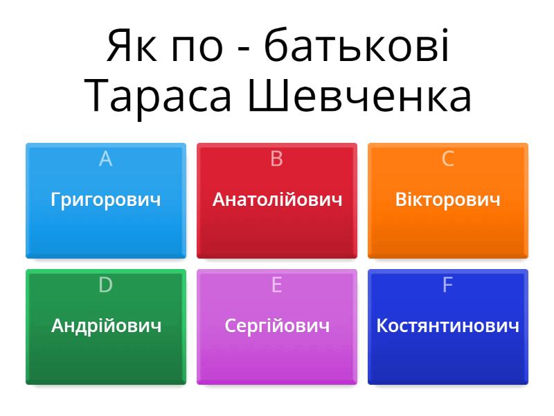 1) Як по - батькові Тараса Шевченка a) Григорович b) Анатолійович c) Вікторович d) Андрійович e) Сергійович f) Костянтинович 2) З поданих слів вибрати іменник a) село b) веселий c) сумно d) гарний e) ходити f) всело