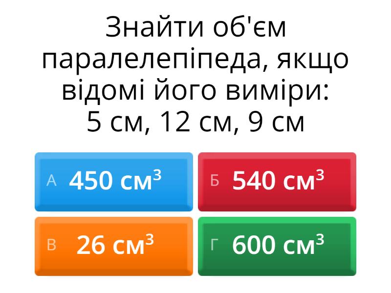 1) Знайти об'єм паралелепіпеда, якщо відомі його виміри: 5 см, 12 см, 9 см a) 540 см3 b) 600 см3 c) 26 см3 d) 450 см3 2) Знайти об'єм куба , якщо його ребро дорівнює 5 см. a) 100 см3 b) 125 см3 c) 300 см3 d) 250 см3 3) Знайти площу поверхні паралелепіпеда, якщо відомі його виміри: 5 см, 12 см, 9 см a) 345 см2 b) 342 см2 c) 279 см2 d) 426 см2 4) Знайти площу поверхні куба , якщо його ребро дорівнює 5 см. a) 150 см2 b) 200 см2 c) 130 см2 d) 180 см2 5) Знайти довжину ребер паралелепіпеда, якщо відомі його виміри: 5 см, 12 см, 9 см a) 96 см b) 100 см c) 104 см d) 80 см 6) Знайти довжину ребер куба , якщо його ребро дорівнює 5 см. a) 60 см b) 50 см c) 70 см d) 40 см