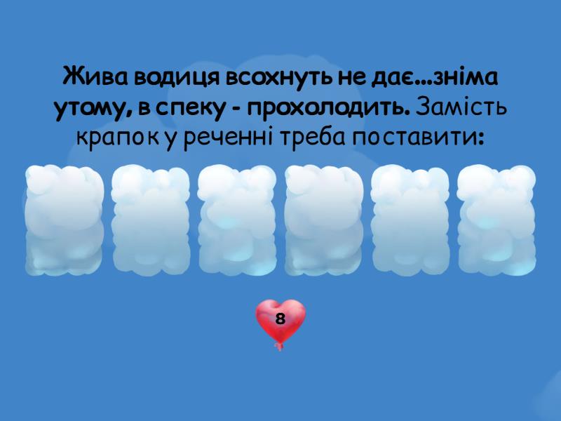1) Жива водиця всохнуть не дає...зніма утому, в спеку - прохолодить. Замість крапок у реченні треба поставити: a) Кому b) Крапку c) Тире d) Двокрапку e) Крапку з комою f) Нічого 2) Минали роки ... учні покидали стіни школи. Замість крапок у реченні треба поставити: a) Тире b) Крапку з комою c) Кому d) Нічого e) Двокрапку f) Знак оклику 3) Вдень почав танути сніг... капали краплі з дахів. Замість крапок у реченні треба поставити: a) Крапку з комою b) Кому c) Знак питання d) Тире e) Двокрапку f) Нічого 4) Гули бджоли над розквітлою липою ... гули джмелі в тон розквітливому згасанню струн. Замість крапок у реченні треба поставити: a) Кому b) Крапку з комою c) Двокрапку d) Тире e) Нічого f) Крапку 5) Не плюй у криницю ... доведеться води напитися. Замість крапок у реченні треба поставити: a) Нічого b) Двокрапку c) Крапку з комою d) Крапку e) Кому f) Тире 6) Бувають дивні на землі діла ... серед зими черешня зацвіла. Замість крапок у реченні треба поставити: a) Двокрапку b) Тире c) Кому d) Крапку з комою e) Нічого f) Крапку 7) Мир будує ... війна руйнує. Замість крапок у реченні треба поставити: a) Тире b) Крапку c) Нічого d) Крапку з комою e) Кому f) Двокрапку 8) Пахло ще травою й мокрим листям... брудні хмари хиталися й вигинались, погойдуючи вкритими вологим болотом спинами. Замість крапок у реченні треба поставити: a) Крапку з комою b) Тире c) Двокрапку d) Кому e) Знак питання f) Нічого